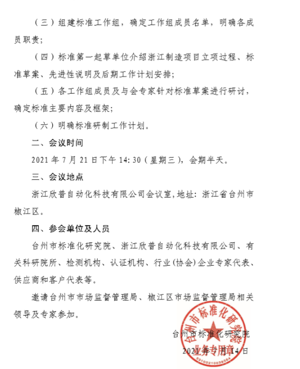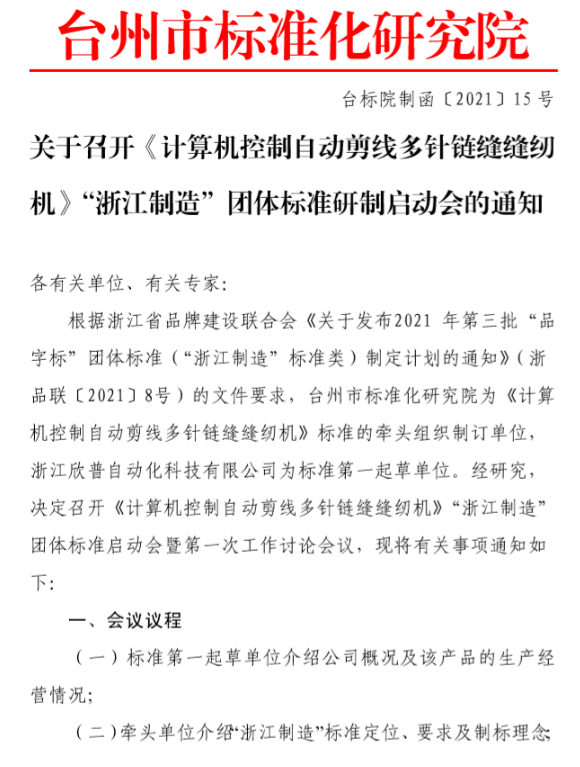 2021年7月21日,浙江欣普自动化科技有限公司《计算机控制自动剪线多针链缝缝纫机》“浙江制造”团体标准启动会暨研讨会在行政中心大楼召开,来自台州市标准化研究院、上海缝纫机研究所、国家缝纫机质量监督检验中心、浙江省缝制机械行业协会等单位的领导和专家参加了此次会议。