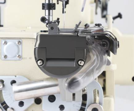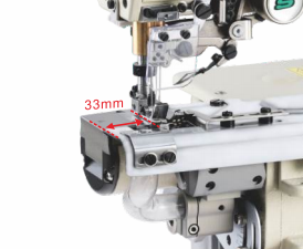 密封式侧盖及短横筒设计:采用密封式侧盖,彻底解决了漏油问题,特殊短横筒设计(自简边到压脚边缘仅33mm),让操作更流畅;采用圆周260mm的细简型设计,车缝小口径的圆筒型针织物更加便利。